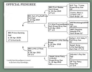 Avec son père Prince 65cm issu de Champions importés, et sa mère Lil’Rose à peine 67cm née d’un couple US petits par la taille et grand par la qualité, il regroupe toutes les lignées de l’élevage.